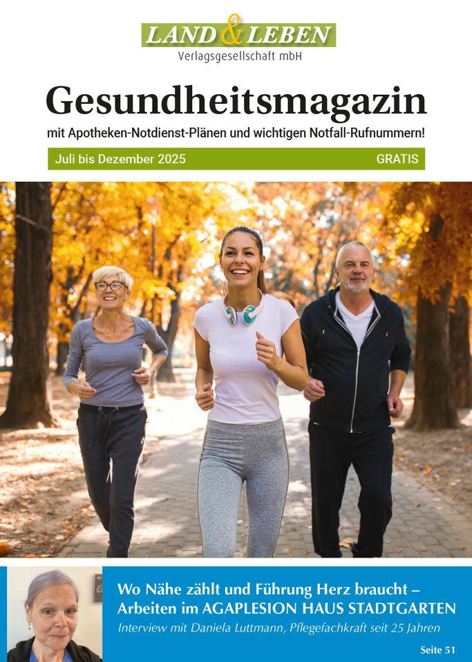 Zweimal im Jahr erscheint unser Gesundheitsmagazin – die regionale Quelle für verständliche Gesundheitsinfos, praktische Alltagstipps und starke Partner vor Ort. Als Ergänzung zum monatlichen Hauptmagazin liefert es einen fokussierten Blick auf alles, was Menschen hier wirklich bewegt: Versorgung, Prävention, Pflege, Wohlbefinden und regionale Ansprechpartner.