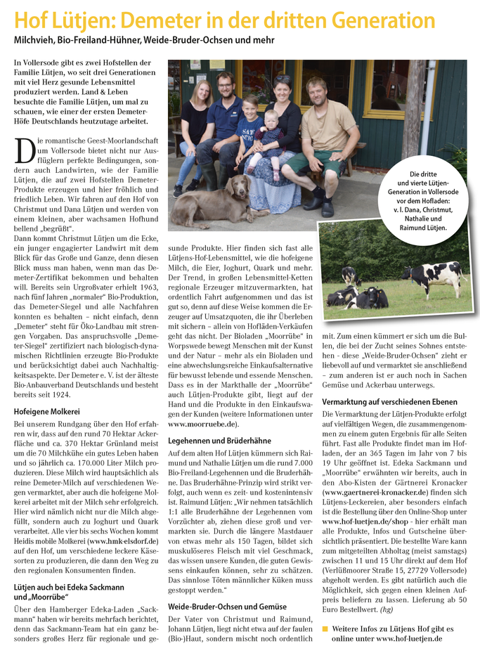 In Vollersode gibt es zwei Hofstellen der Familie Lütjen, wo seit drei Generationen mit viel Herz gesunde Lebensmittel produziert werden. Land & Leben besuchte die Familie Lütjen, um mal zu schauen, wie einer der ersten Demeter-Höfe Deutschlands heutzutage arbeitet.