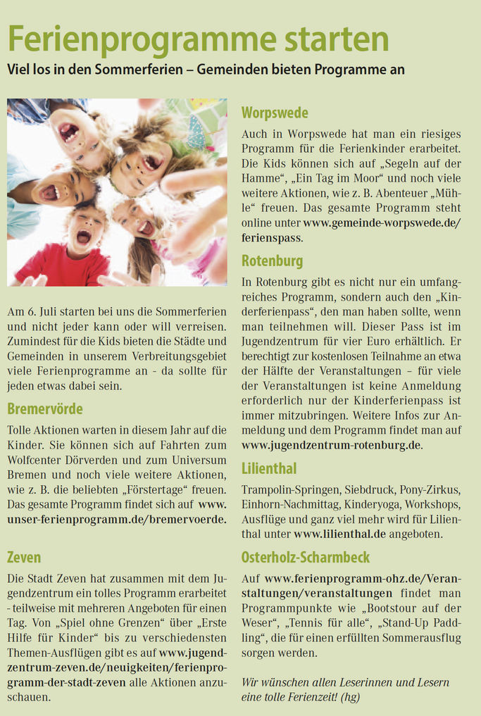 Auch in Worpswede hat man ein riesiges Programm für die Ferienkinder erarbeitet. Die Kids können sich auf „Segeln auf der Hamme“, „Ein Tag im Moor“ und noch viele weitere Aktionen, wie z. B. Abenteuer „Mü-le“ freuen. Das gesamte Programm steht online unter www.gemeinde-worpswede.de/ ferienspass.