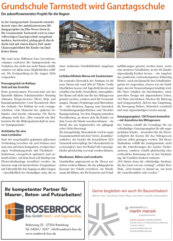 Was in Tarmstedt entsteht, ist damit mehr als ein Bauprojekt. Es ist ein zukunftsweisendes Modell für zeitgemäße Bildung, das auch für andere Kommunen Impulsgeber sein kann. Verwaltung, Politik, Schule und Elternschaft ziehen hier gemeinsam an einem Strang – ein Projekt, auf das die gesamte Samtgemeinde stolz sein darf.