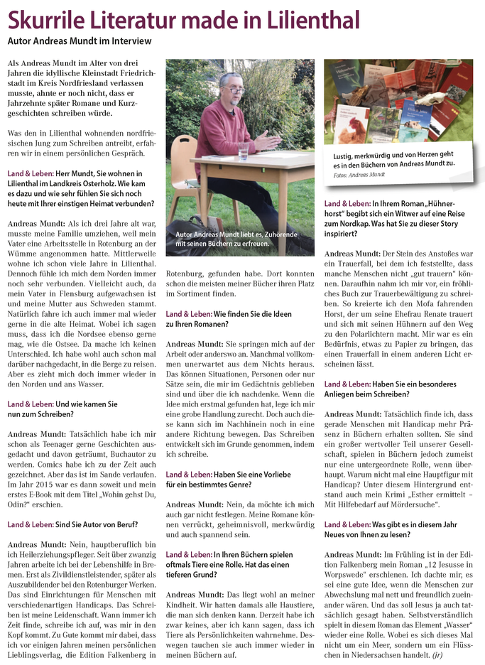 Andreas Mundt: Nein, hauptberuflich bin ich Heilerziehungspfleger. Seit über zwanzig Jahren arbeite ich bei der Lebenshilfe in Bremen. Erst als Zivildienstleistender, später als Auszubildender bei den Rotenburger Werken. Das sind Einrichtungen für Menschen mit verschiedenartigen Handicaps. Das Schreiben ist meine Leidenschaft. Wann immer ich Zeit finde, schreibe ich auf, was mir in den Kopf kommt. Zu Gute kommt mir dabei, dass ich vor einigen Jahren meinen persönlichen Lieblingsverlag, die Edition Falkenberg in