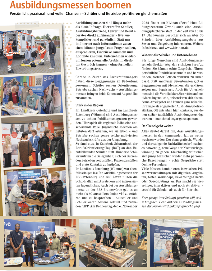 Im Landkreis Rotenburg (Wümme) war ebenfalls einiges los: Die Ausbildungsmessen der BBS Rotenburg und BBS Zeven füllten die Schul-Hallen mit Ausstellern und interessierten Jugendlichen. Auch bei der Ausbildungsmesse an der BBS Bremervörde gab es an mehr als 60 Ausstellerständen viel zu erfahren und zu besprechen – Aussteller und Schüler waren bestens gelaunt und zufrieden. TIPP: Am Donnerstag, den 6. November 2025 findet am Kivinan (Berufliches Bildungszentrum Zeven) auch eine Ausbildungsplatzbörse statt. In der Zeit von 15 bis 17 Uhr können Besucher sich an über 30 Ständen über Ausbildungsangebote aus Zeven und Umgebung informieren. Weitere Infos hierzu auf www.kivinan.de.