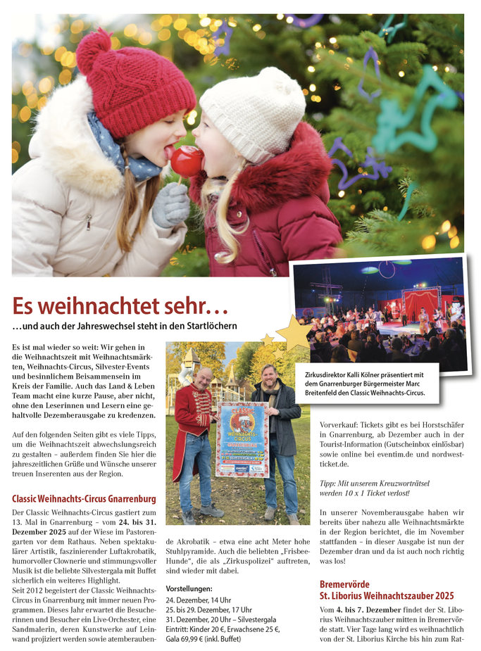 Es ist mal wieder so weit: Wir gehen in die Weihnachtszeit mit Weihnachtsmärkten, Weihnachts-Circus, Silvester-Events und besinnlichem Beisammensein im Kreis der Familie. Auch das Land & Leben Team macht eine kurze Pause, aber nicht, ohne den Leserinnen und Lesern eine gehaltvolle Dezemberausgabe zu kredenzen.