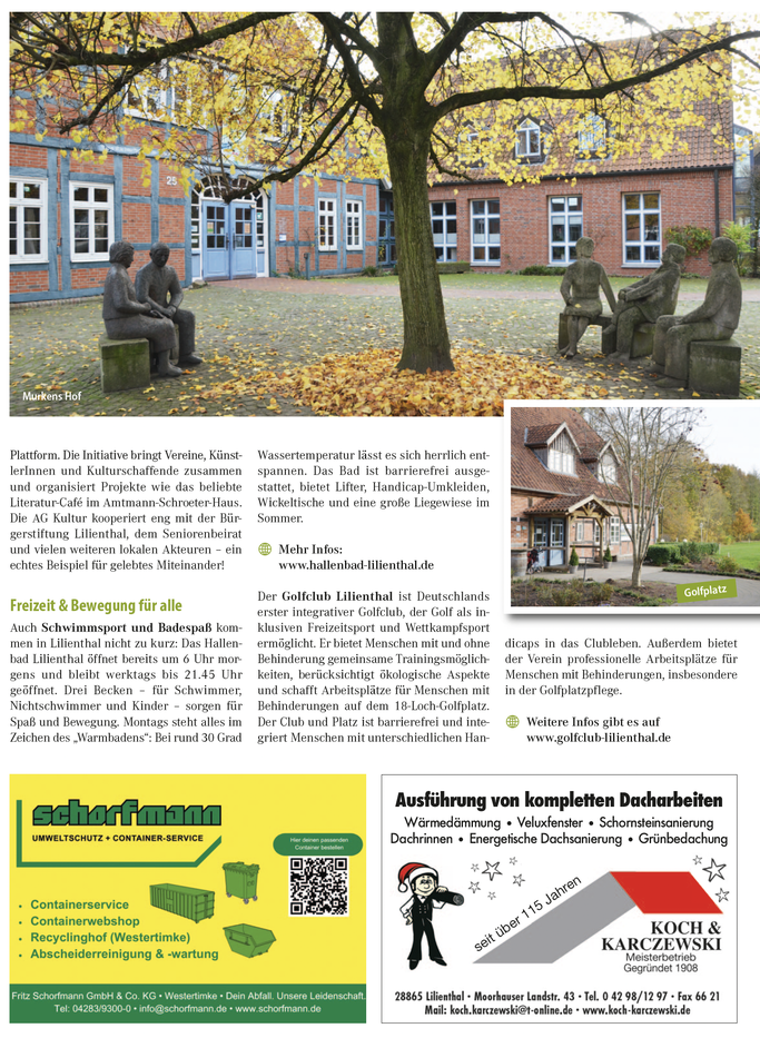 Das kulturelle Zentrum der Gemeinde ist Murkens Hof – ein liebevoll restauriertes Fachwerkhaus im Herzen Lilienthals, direkt neben dem Rathaus und der historischen Klosterkirche. Hier pulsiert das kulturelle Leben: Die Galerie zeigt wechselnde Ausstellungen, im Schroeter Saal finden Konzerte, Lesungen, Kinoabende und Vorträge statt. Ein Ort, der Geschichte atmet – und gleichzeitig moderner Treffpunkt für alle Generationen ist.