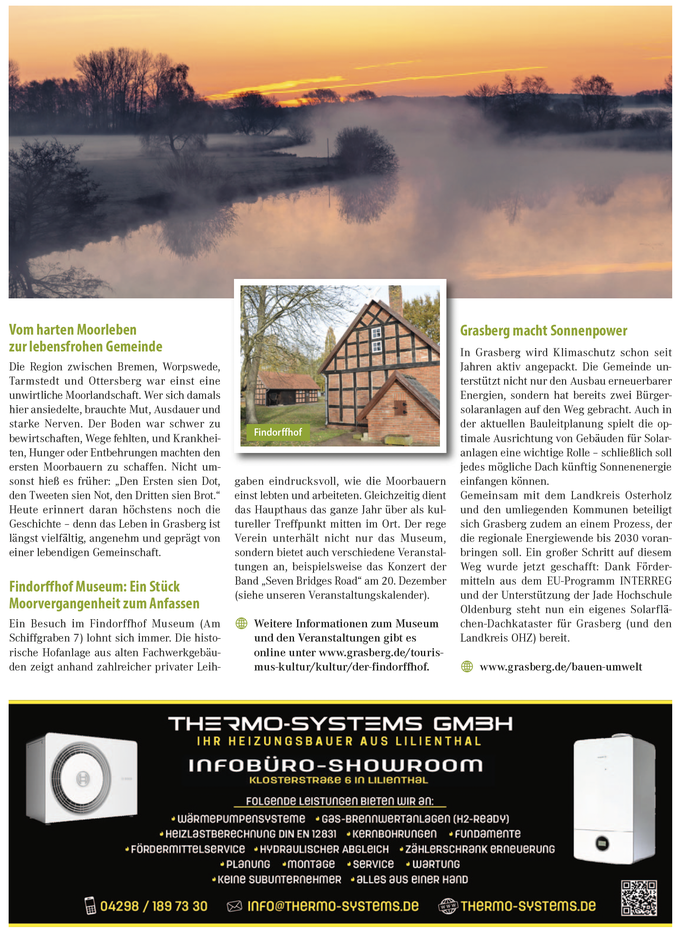 Ein Besuch im Findorffhof Museum (Am Schiffgraben 7) lohnt sich immer. Die historische Hofanlage aus alten Fachwerkgebäuden zeigt anhand zahlreicher privater Leihgaben eindrucksvoll, wie die Moorbauern einst lebten und arbeiteten. Gleichzeitig dient das Haupthaus das ganze Jahr über als kultureller Treffpunkt mitten im Ort. Der rege Verein unterhält nicht nur das Museum, sondern bietet auch verschiedene Veranstaltungen an, beispielsweise das Konzert der Band „Seven Bridges Road“ am 20. Dezember (siehe unseren Veranstaltungskalender).