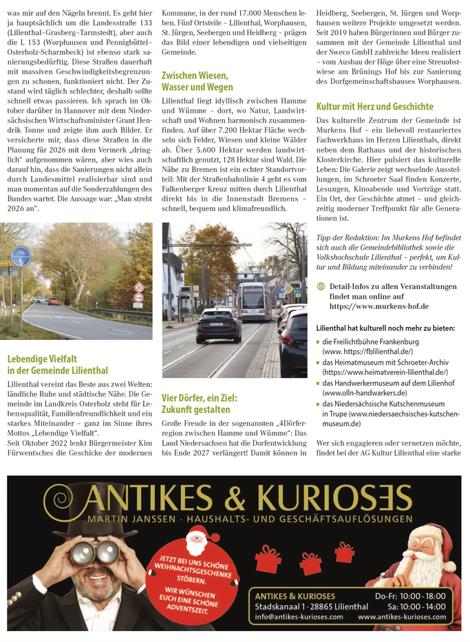 Wer von Grasberg in Richtung Lilienthal fährt (und wer von Tarmstedt in Richtung Grasberg fährt) hat es schon seit einiger Zeit nicht leicht. Die sanierungsbedürftigen Moorstraßen erfordern gute Stoßdämpfer und Nerven, denn man darf auf diesen Strecken überwiegend nicht schneller als 50 km/h fahren. Die Straße vom Grasberger Kreisverkehr nach Worpswede wurde kürzlich komplett saniert. Wir fragen uns, ob und wann dies auch mit den anderen Straßen passiert und haben recherchiert. Wir sprachen darüber mit Axel Miesner (CDU, Mitglied des Niedersächsischen Landtages für den Wahlkreis-OHZ): „Ein wirklich wichtiges Thema, was mir auf den Nägeln brennt. Es geht hier ja hauptsächlich um die Landesstraße 133 (Lilienthal–Grasberg–Tarmstedt), aber auch die L 153 (Worphausen und Pennigbüttel–Osterholz-Scharmbeck) ist ebenso stark sanierungsbedürftig. Diese Straßen dauerhaft mit massiven Geschwindigkeitsbegrenzungen zu schonen, funktioniert nicht. Der Zustand wird täglich schlechter, deshalb sollte schnell etwas passieren. Ich sprach im Ok-tober darüber in Hannover mit dem Niedersächsischen Wirtschaftsminister Grant Hendrik Tonne und zeigte ihm auch Bilder. Er versicherte mir, dass diese Straßen in die Planung für 2026 mit dem Vermerk „dringlich“ aufgenommen wären, aber wies auch darauf hin, dass die Sanierungen nicht allein durch Landesmittel realisierbar sind und man momentan auf die Sonderzahlungen des Bundes wartet. Die Aussage war: „Man strebt 2026 an“.