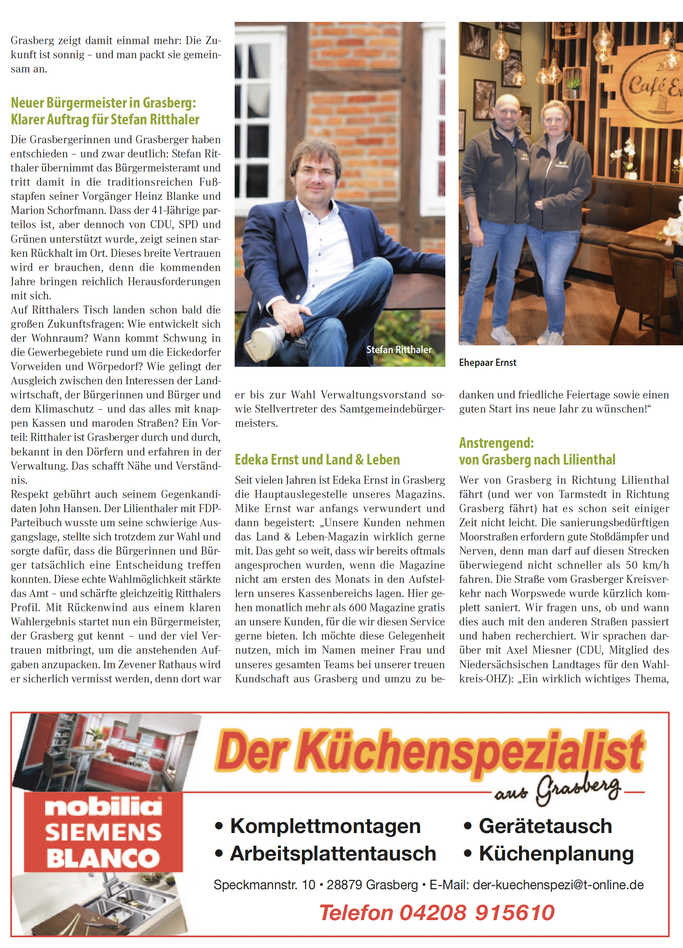 Seit vielen Jahren ist Edeka Ernst in Grasberg die Hauptauslegestelle unseres Magazins. Mike Ernst war anfangs verwundert und dann begeistert: „Unsere Kunden nehmen das Land & Leben-Magazin wirklich gerne mit. Das geht so weit, dass wir bereits oftmals angesprochen wurden, wenn die Magazine nicht am ersten des Monats in den Aufstellern unseres Kassenbereichs lagen. Hier gehen monatlich mehr als 600 Magazine gratis an unsere Kunden, für die wir diesen Service gerne bieten. Ich möchte diese Gelegenheit nutzen, mich im Namen meiner Frau und unseres gesamten Teams bei unserer treuen Kundschaft aus Grasberg und umzu zu bedanken und friedliche Feiertage sowie einen guten Start ins neue Jahr zu wünschen!“