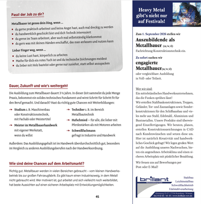 Die Brillant Metallverarbeitung GmbH sucht zum 1. September 2026 Auszubildende als Metallbauer (m/w/d), Fachrichtung Konstruktionstechnik.